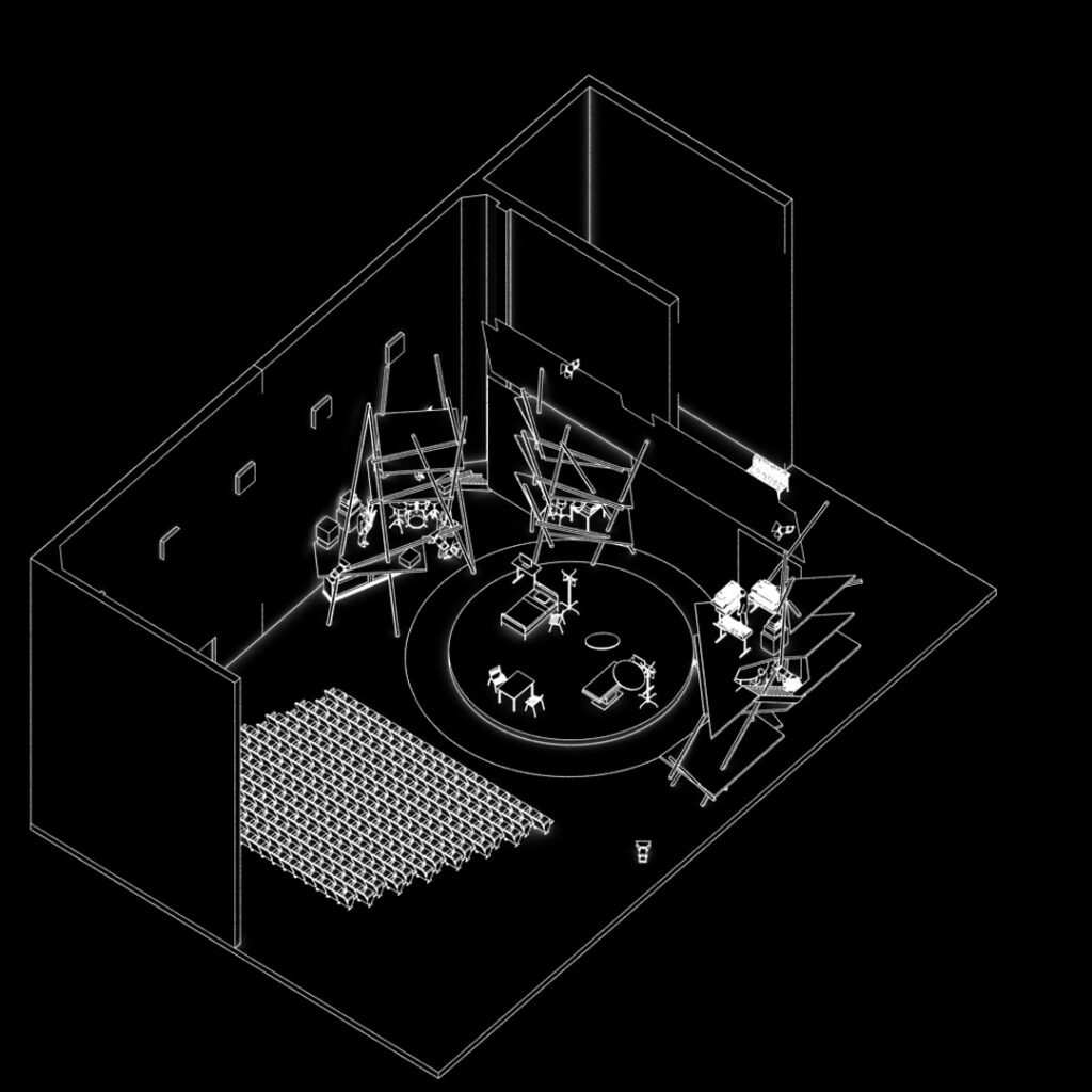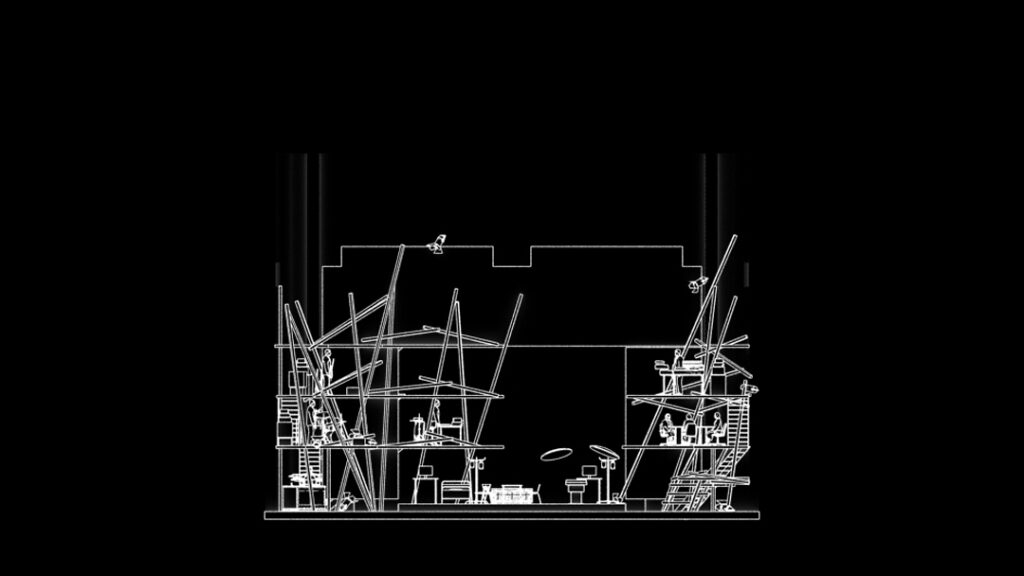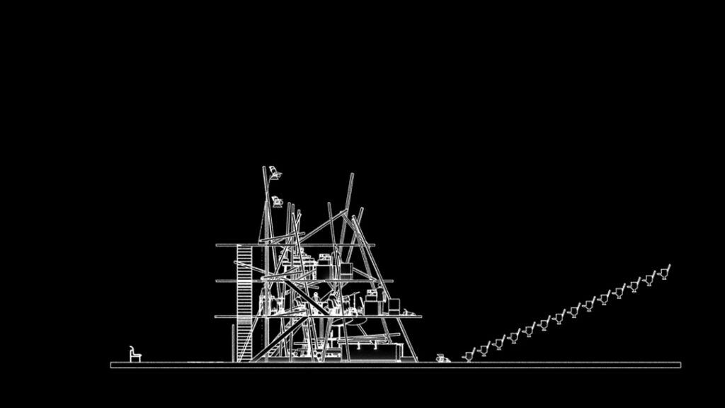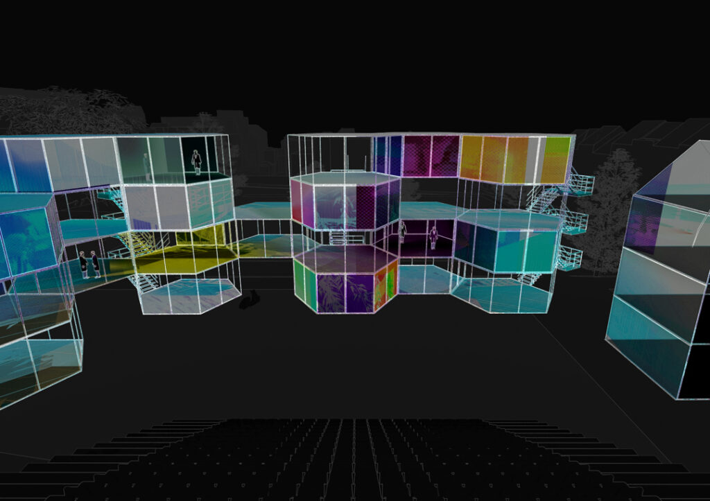 Une boîte-laboratoire fragmentée, où la scénographie devient organique, rythme et architecture narrative.