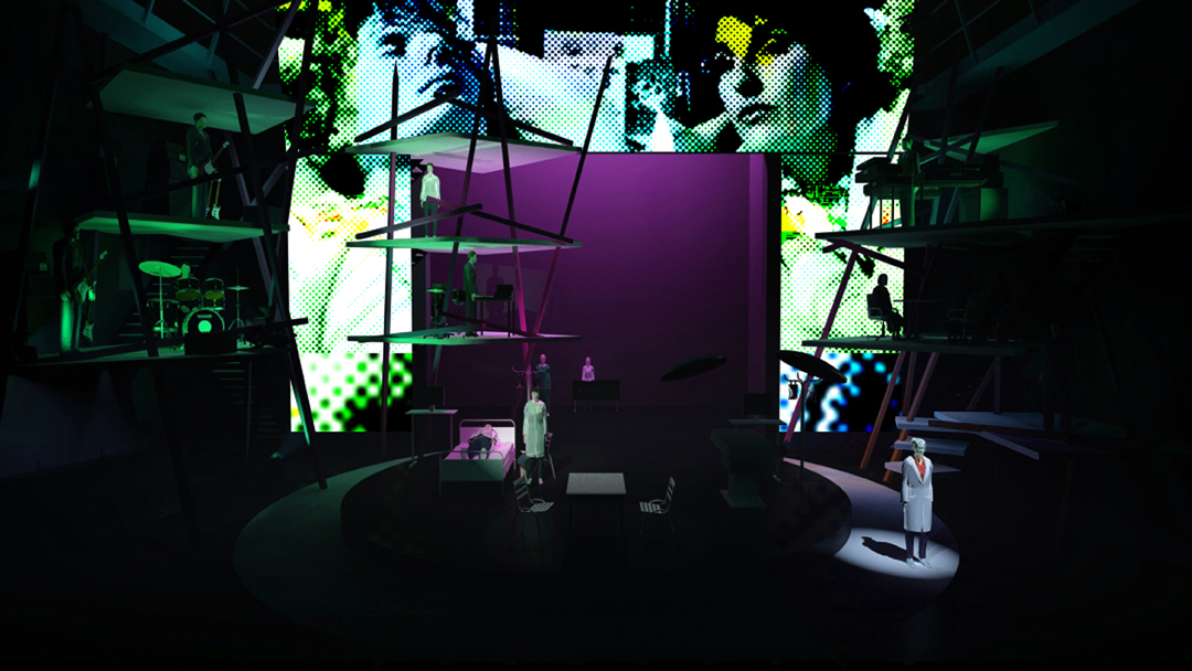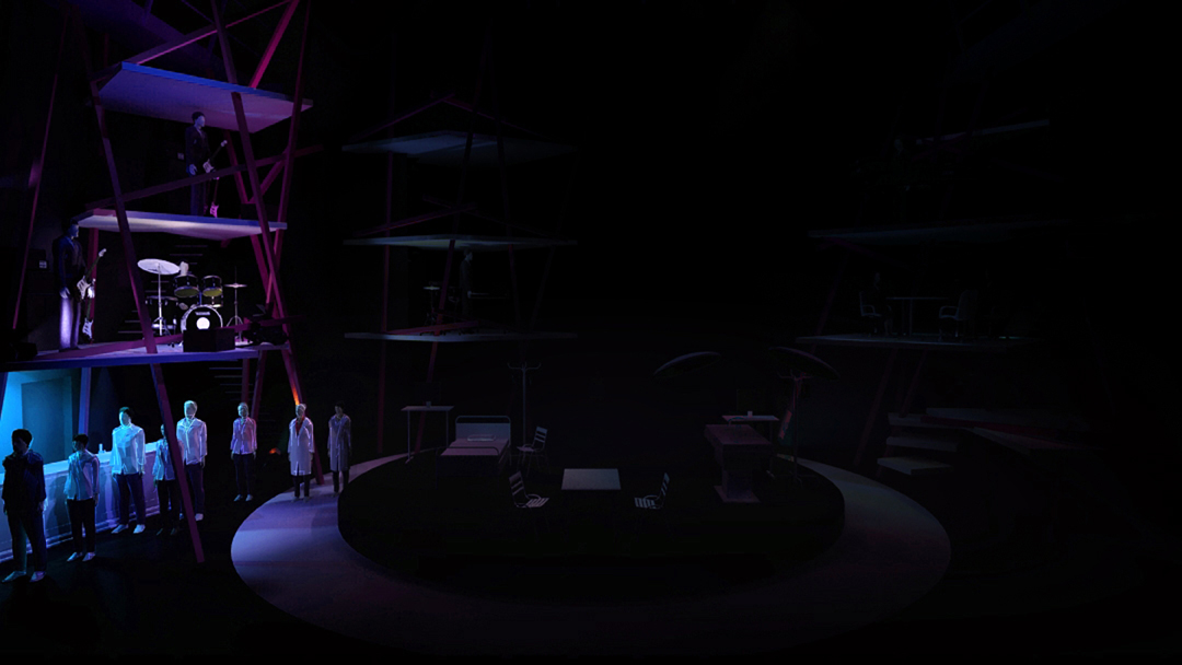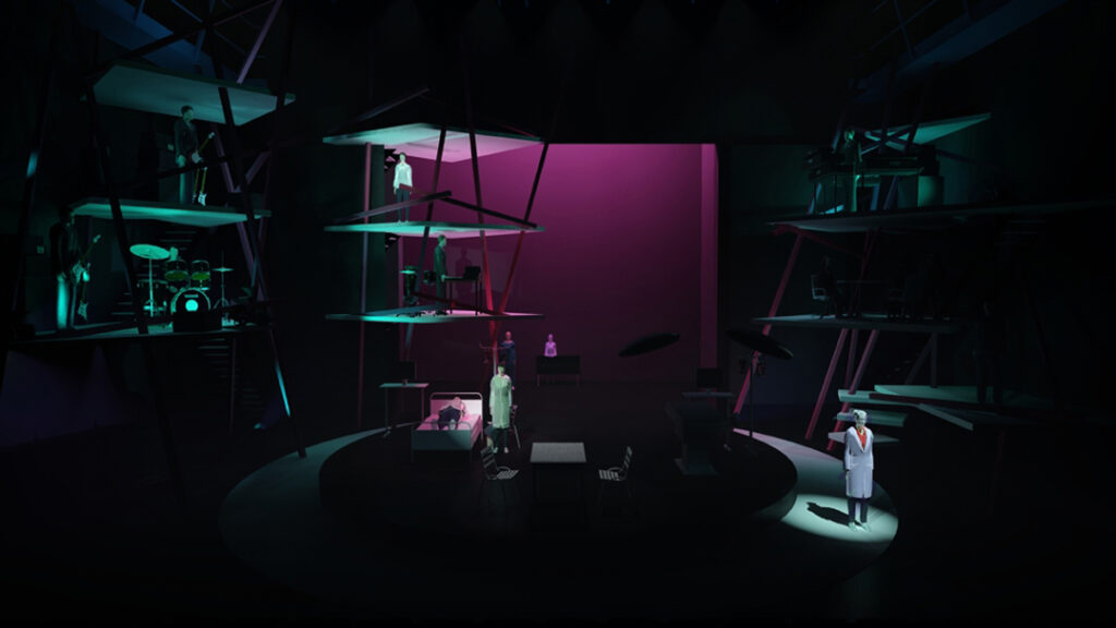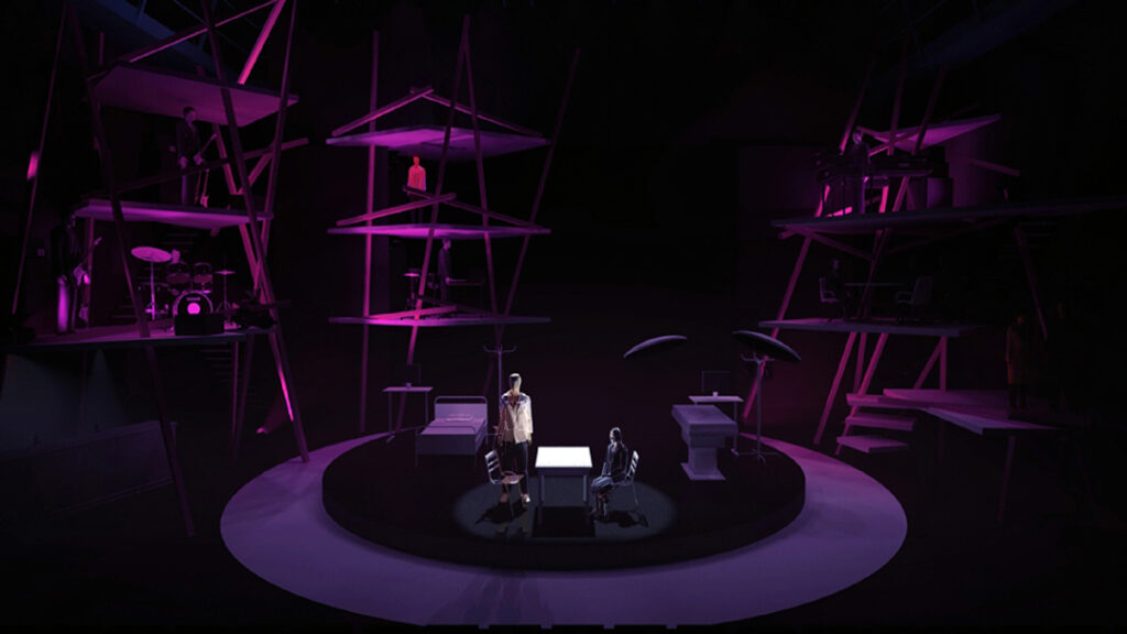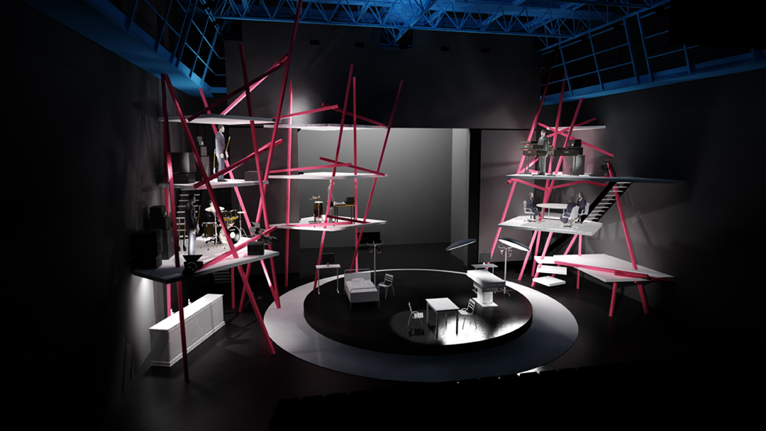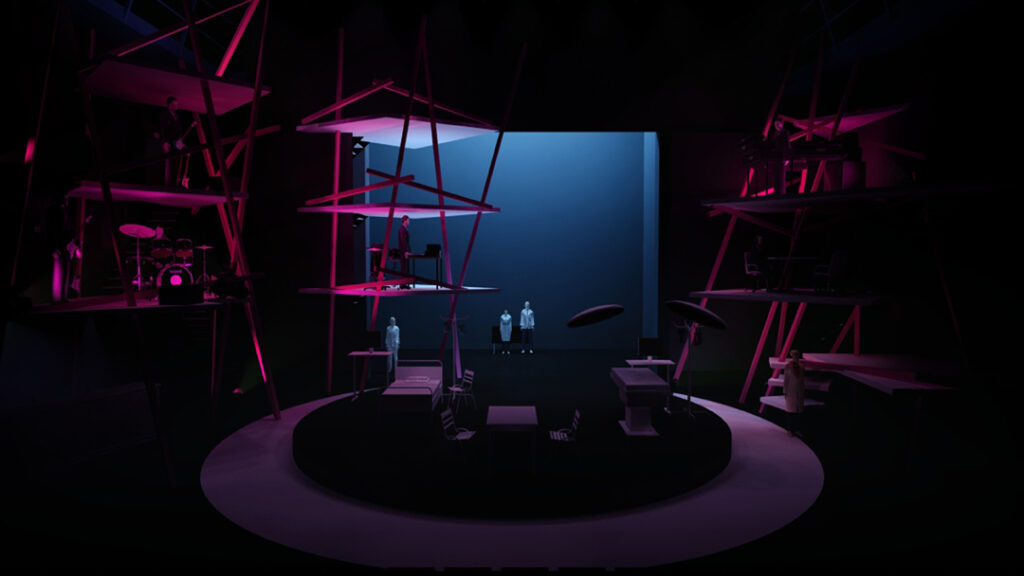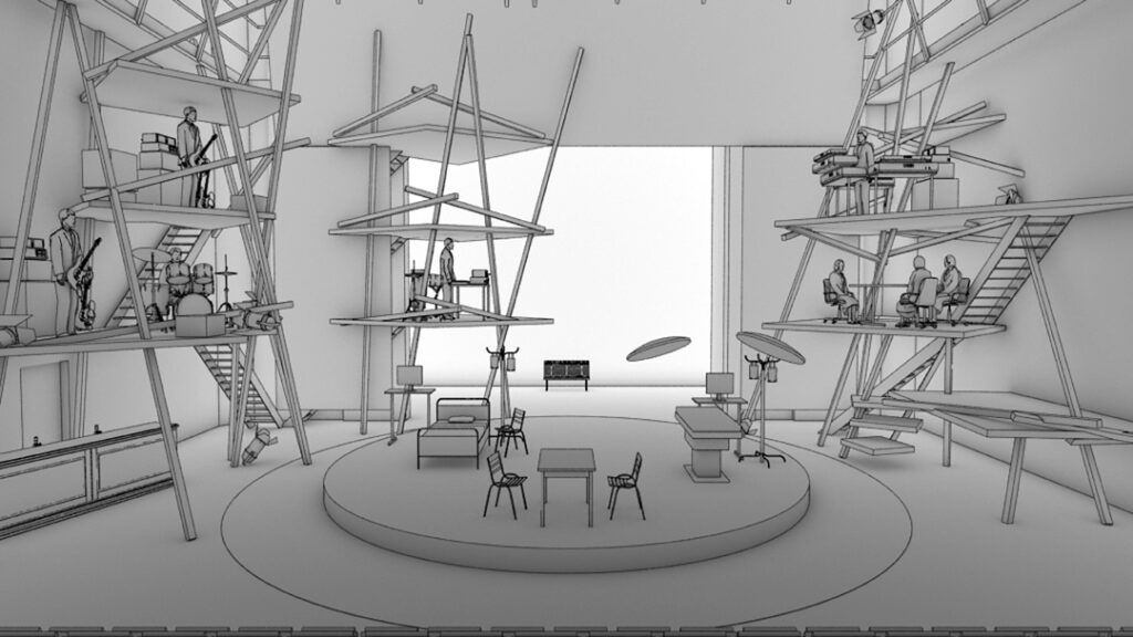 Scène intérieure repartie en jardin-cour, structure fine inspirée de l’anatomie, plateformes triangulaires pour acteurs actrices et musiciens dispersés. Éclairage sculptant, modulant, découpant.