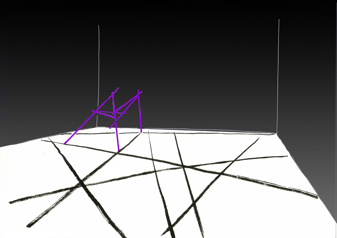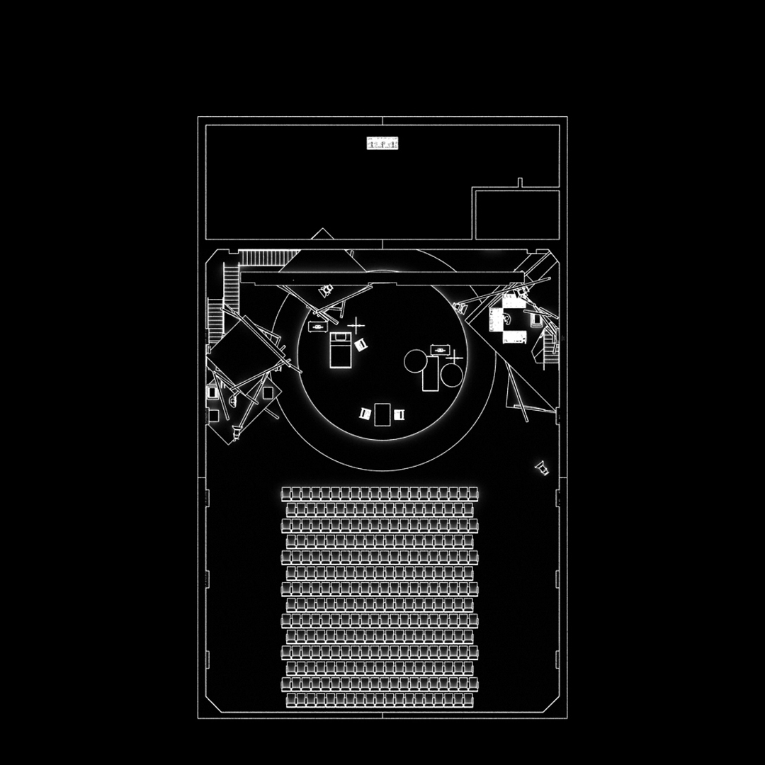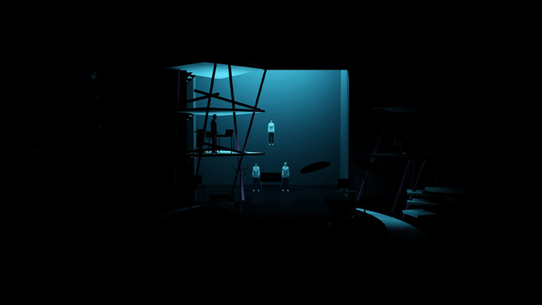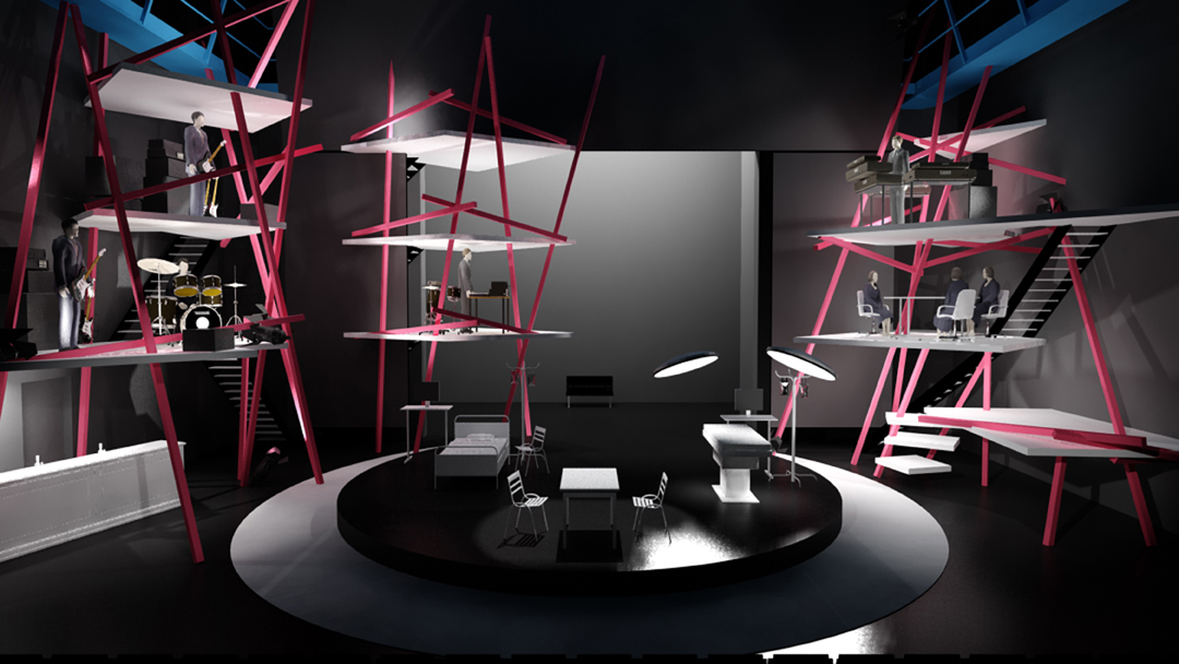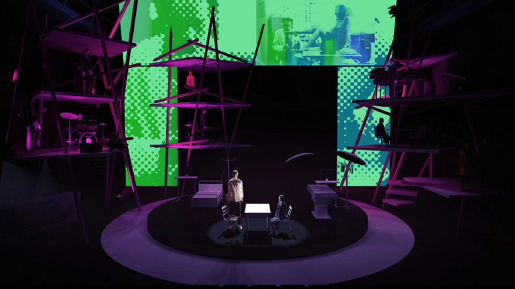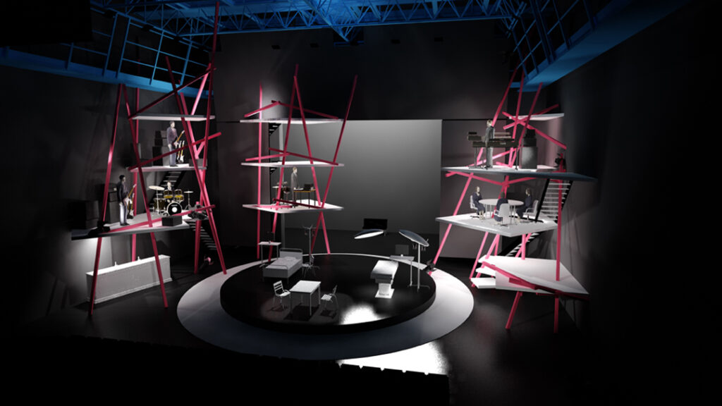 Scène intérieure repartie en jardin-cour, structure fine inspirée de l’anatomie, plateformes triangulaires pour acteurs actrices et musiciens dispersés. Éclairage sculptant, modulant, découpant.