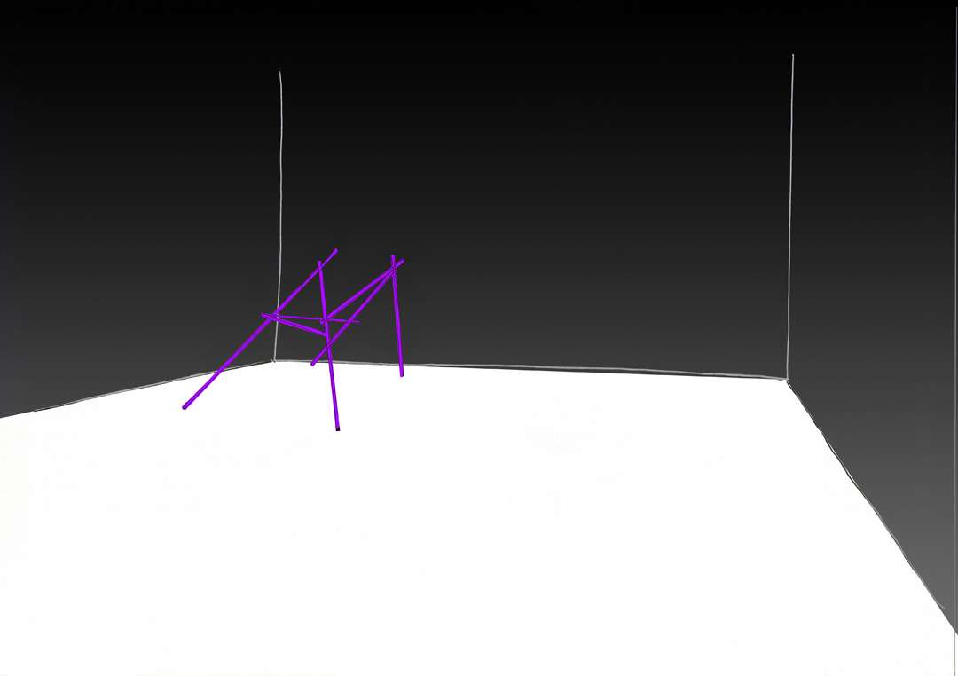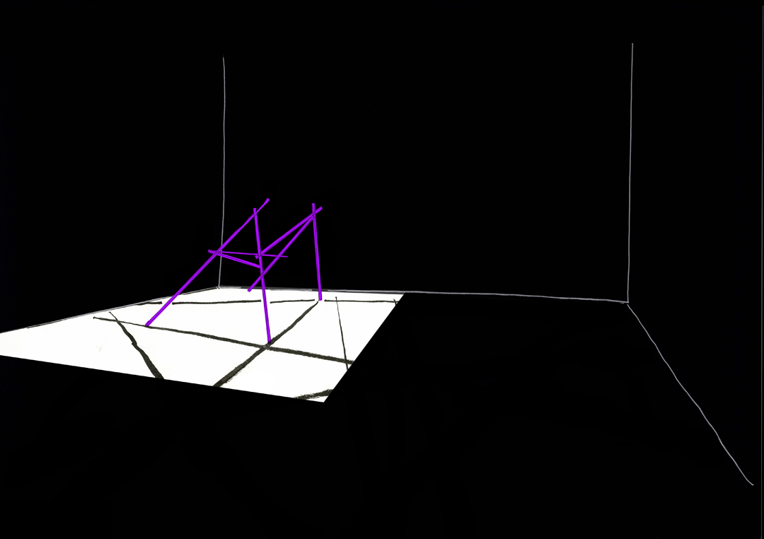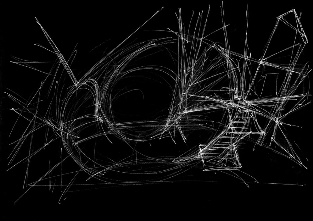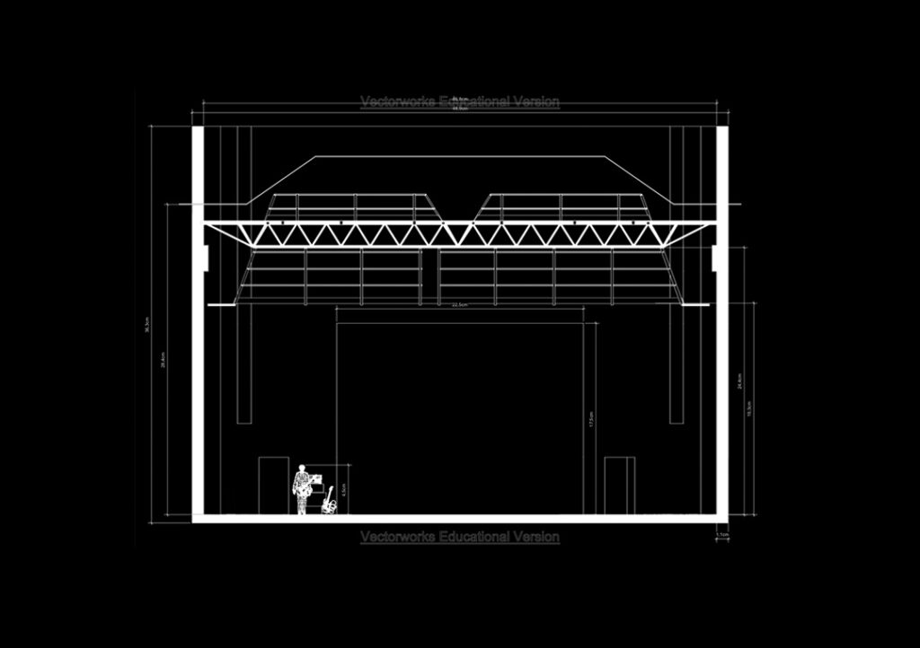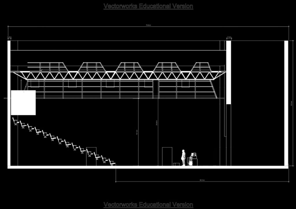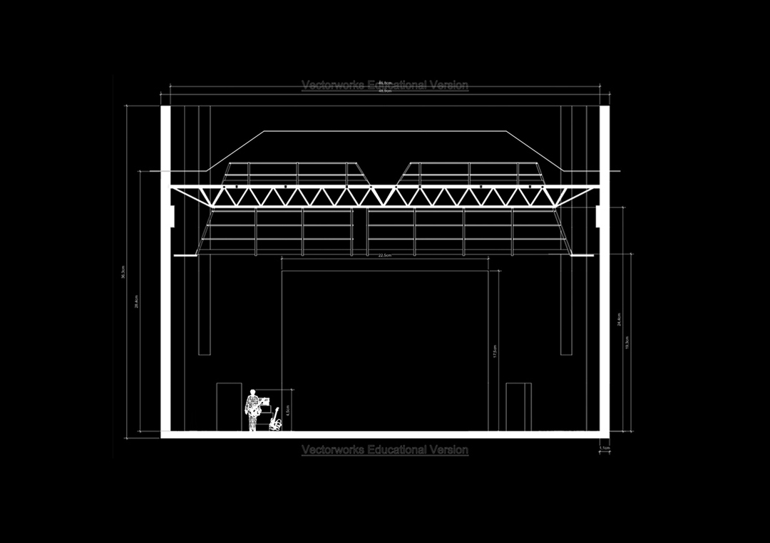 Scène intérieure repartie en jardin-cour, structure fine inspirée de l’anatomie, plateformes triangulaires pour acteurs actrices et musiciens dispersés. Éclairage sculptant, modulant, découpant.
