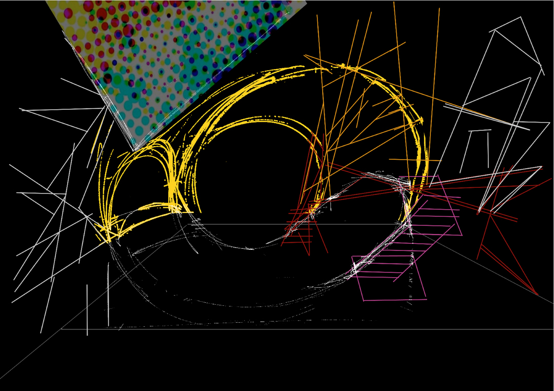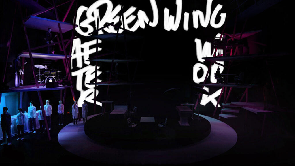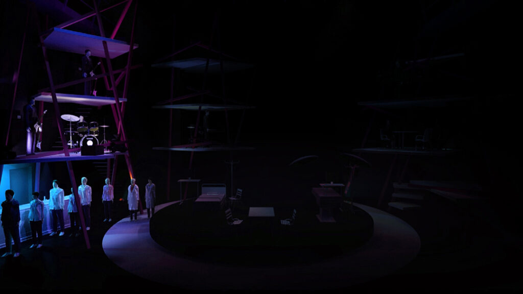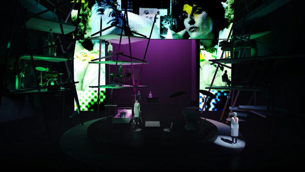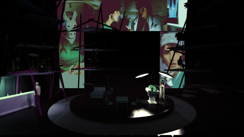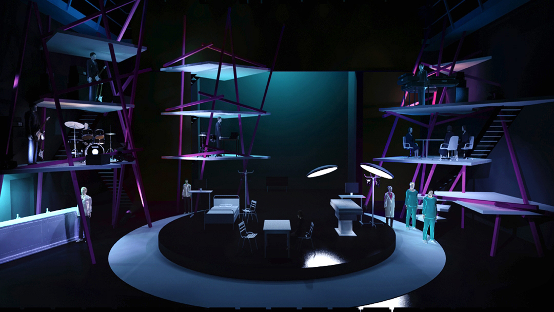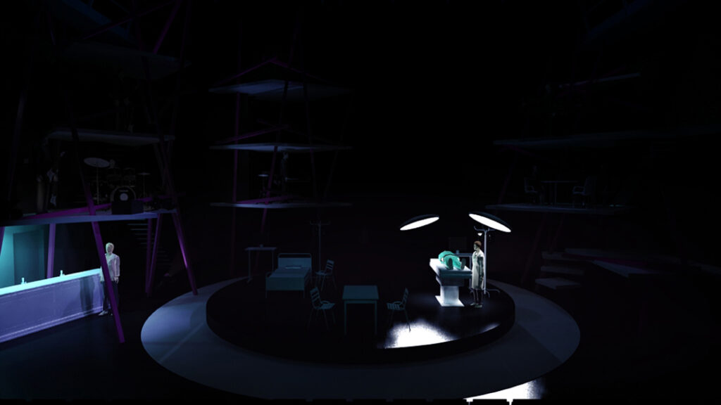 Encadrement du décor par des écrans LED. Tournette centrale avec lit de coma, table RH, table d’opération. Chemin blanc circulaire, le pub à jardin, le banc à lointain.